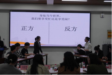 为提升学生的思辨能力和创造能力,激发同学们自主思考能力,营造浓厚的思辨氛围,充分展示当代大学生昂扬向上,敢于质疑的青春风采,4月10日,能环学院联合外国语学院在教一401教室开展了“吾口辩吾心”主题辩论赛半决赛。本次双方各派出两支队伍,就辩题“幸福感是通过物质追求还是精神满足实现的”、“在当下世界,是享受闲还是享受忙”展开激烈辩论。辩论赛邀请到双方学院心理站站长等作为评委,百余位同学现场观赛。