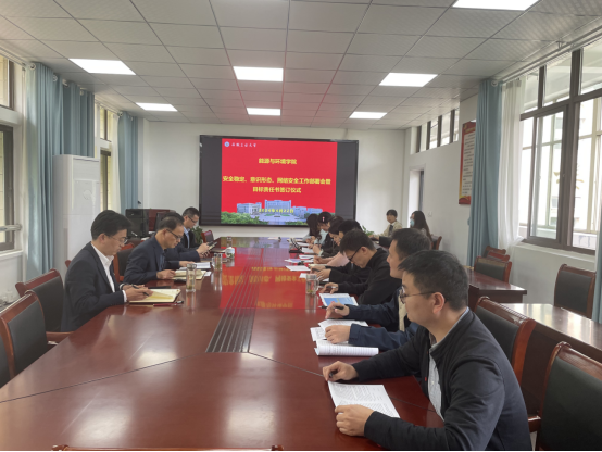 谢文平、钱付平代表学院党政与系党政班子、全体科级干部及全体辅导员签订《76net必赢线路检测中心2024年安全稳定、意识形态和网络安全工作目标责任书》。