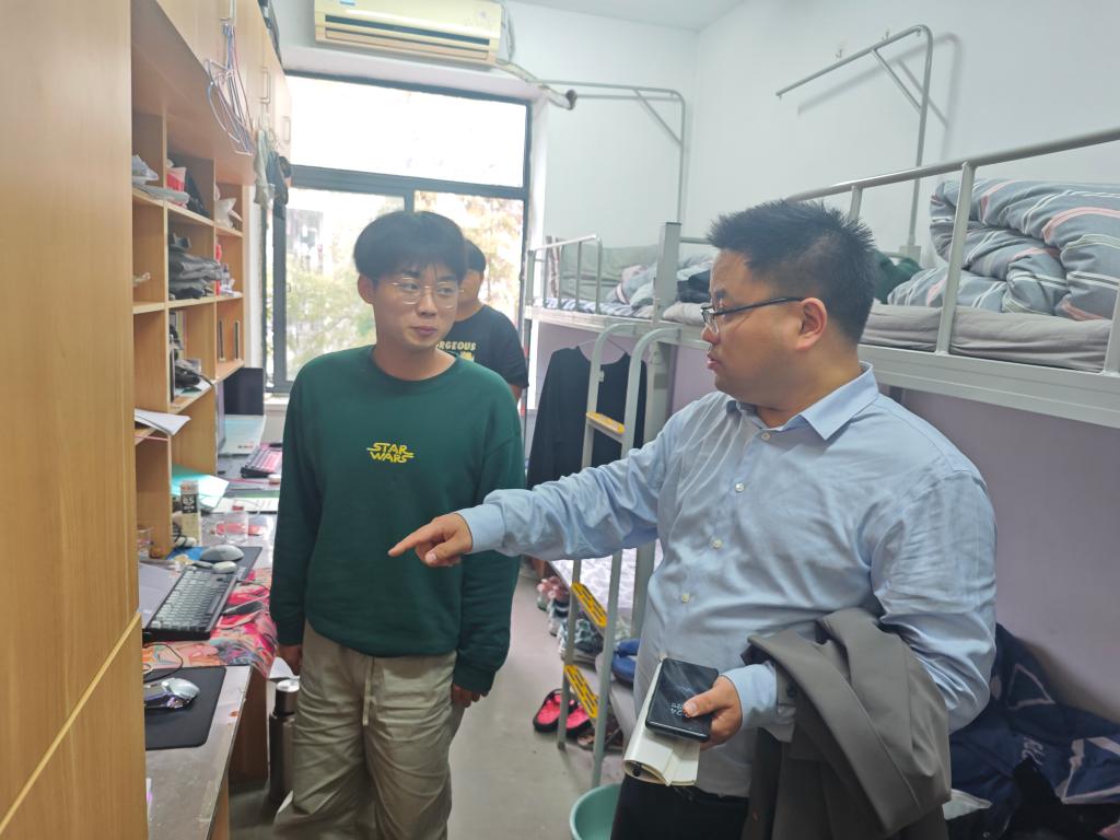 学工队伍对宿舍区进行了全面的安全卫生检查,包括消防设施、用电安全、宿舍卫生状况等。对检查过程中发现的安全隐患和卫生问题,当即对相应学生宿舍提出了整改要求。卫军帅一行走进各个学生宿舍,与学生进行了亲切的交流,了解他们的生活状况和需求,同时传达了学院对学生的关心与支持。他强调最近天气变化多样,同学们要注意饮食和穿衣,照顾好身体。另外,最近期中考试周临近,要做好功课复习,诚信考试。