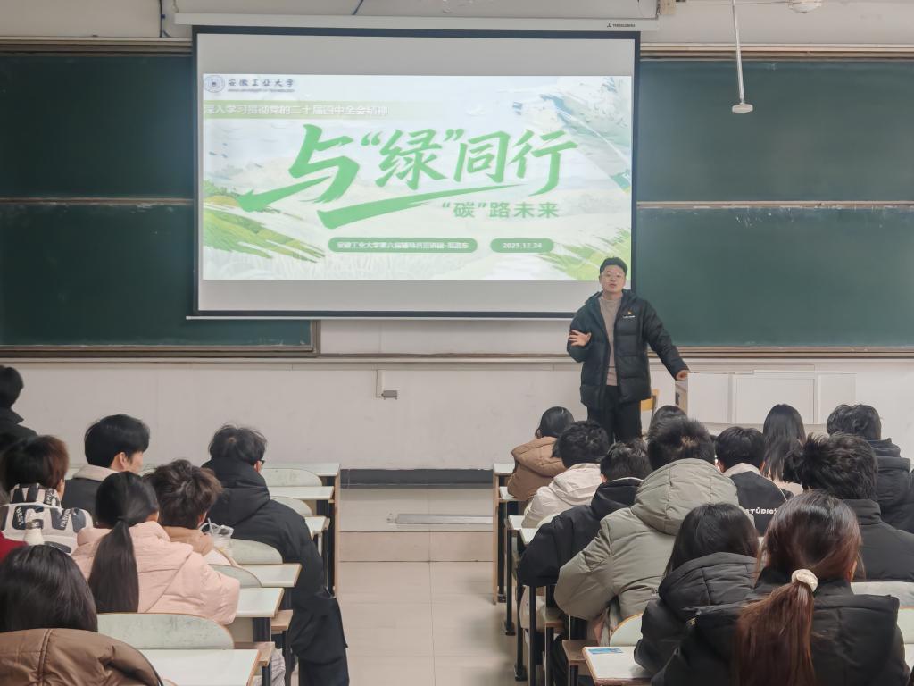 为深入学习贯彻党的二十届四中全会精神,校第六届辅导员宣讲团成员范浩东于2025年12月25日上午在佳山校区教三南201面向76net必赢线路检测中心学生开展主题为“与‘绿’同行、‘碳’路未来”的宣讲。