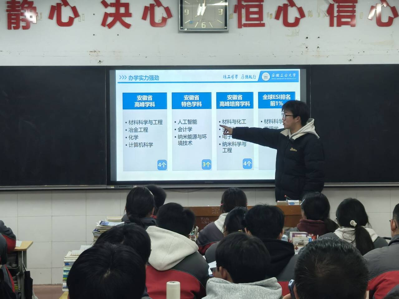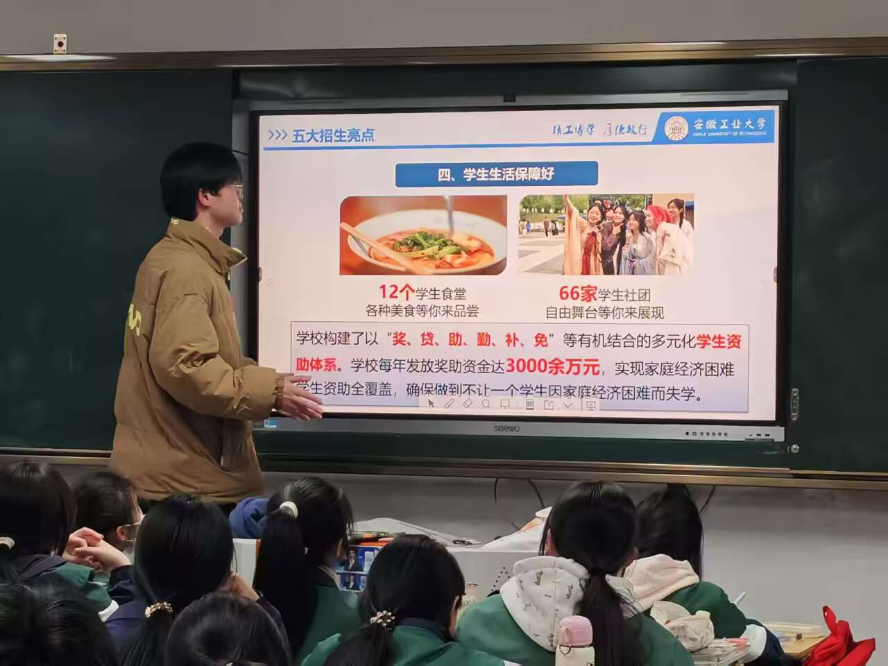 宣讲期间,队员们以“学长学姐”身份,化身工大“形象代言人”,通过“走进安工大”“办学实力”“招生亮点”“报考建议”等多个模块,系统展示bwin必赢线路检测的区位优势、学科实力、师资力量、校园文化及就业前景。围绕76net必赢线路检测中心特色专业,队员们结合国家“双碳”战略背景,详细介绍专业课程体系、就业方向及行业发展趋势,帮助学弟学妹直观感知绿色发展领域的广阔前景。