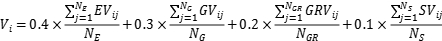 其中,i∈{1,2,3};GV 、EV、GRV和SV分别为毕业生反馈的打分值、企业反馈的打分值、毕业要求反馈的打分值和应届毕业生反馈的打分值;NG、NE、NGR和NS分别为毕业生反馈、企业反馈、毕业要求反馈和应届毕业生反馈的数据总量。系数为各评价来源数据占培养目标合理性和达成度评价的权重。